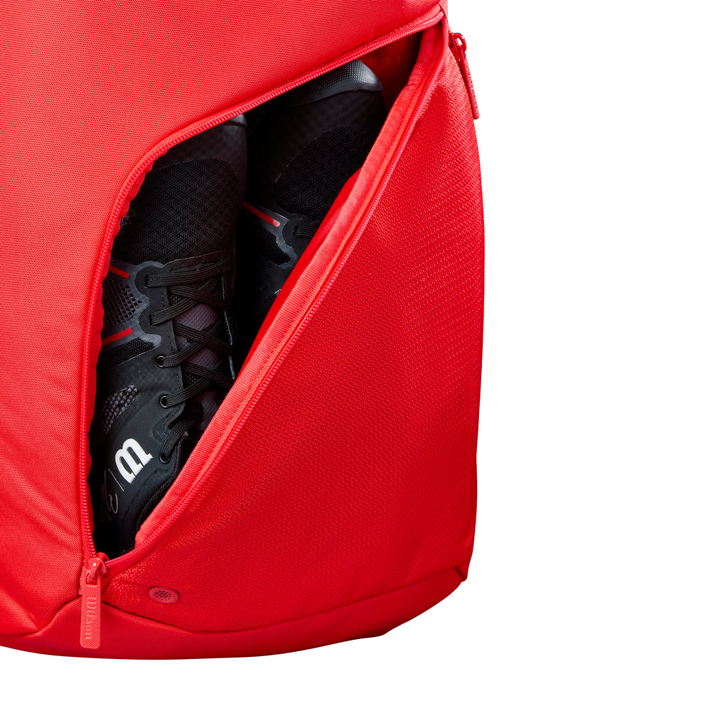 Travel to and from the courts with gear organized and accessories on hand. The Tour Red Padel Backpack provides versatility and protection for equipment, fashioned in Wilson's iconic red color. It features two large main compartments, one with Thermofoil lining to protect equipment from extreme temperatures. A zip accessory pocket in the front is the perfect spot for storing smaller items and valuables. Made from durable polyester, the bag offers two ways to carry it: either by hand with a top grab handle or using the padded shoulder straps.