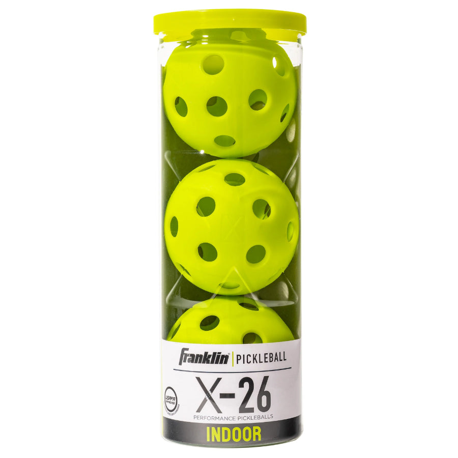 The Franklin X-26 indoor model has been specially crafted for outstanding performance on all indoor pickleball court surfaces. The solid two-piece construction and bevelled holes ensure that the X-26 pickleballs are constructed for premium durability and playability. These indoor pickleballs are designed with 26 precise holes to ensure even rotation, spin and bounce for consistent play from match to match. Perfect for both training and competitive matches, the X-26 is USA Pickleball (USAPA) approved for tournament play.