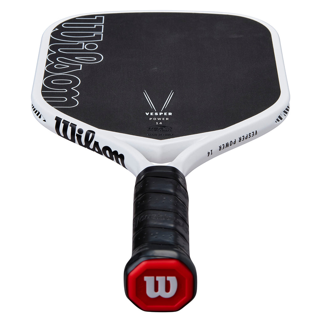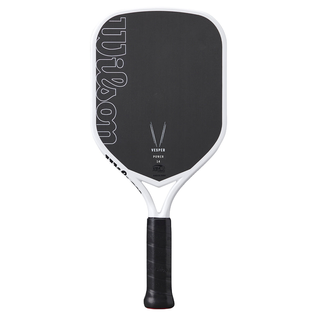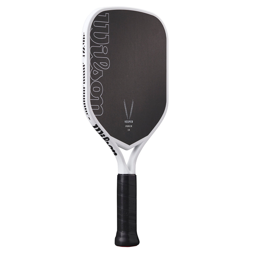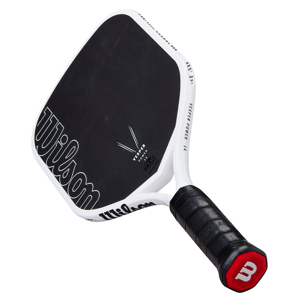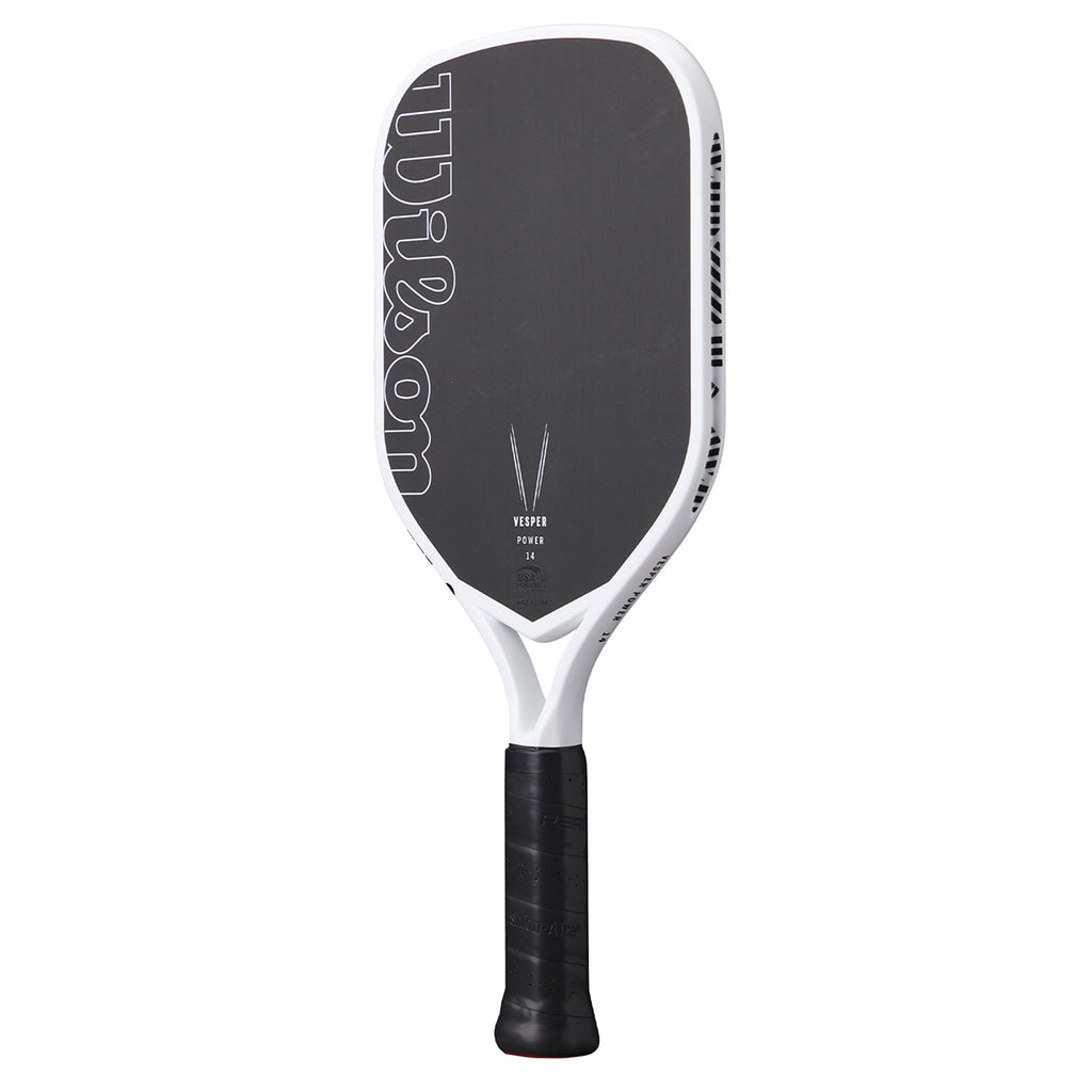 Wilson's Vesper Power 14 Pickleball Paddle is engineered for competitive players seeking enhanced power and precision. Its innovative bladder moulded frame and open-throat design improves feel and introduce controlled flex, delivering superior power, speed, and manoeuvrability. The elongated shape and extended one-piece handle increase reach and enable powerful, consistent two-handed backhands. Featuring a raw hybrid face with a fiberglass base layer, this paddle maximises power without compromising control, making it an ideal choice for advanced play.